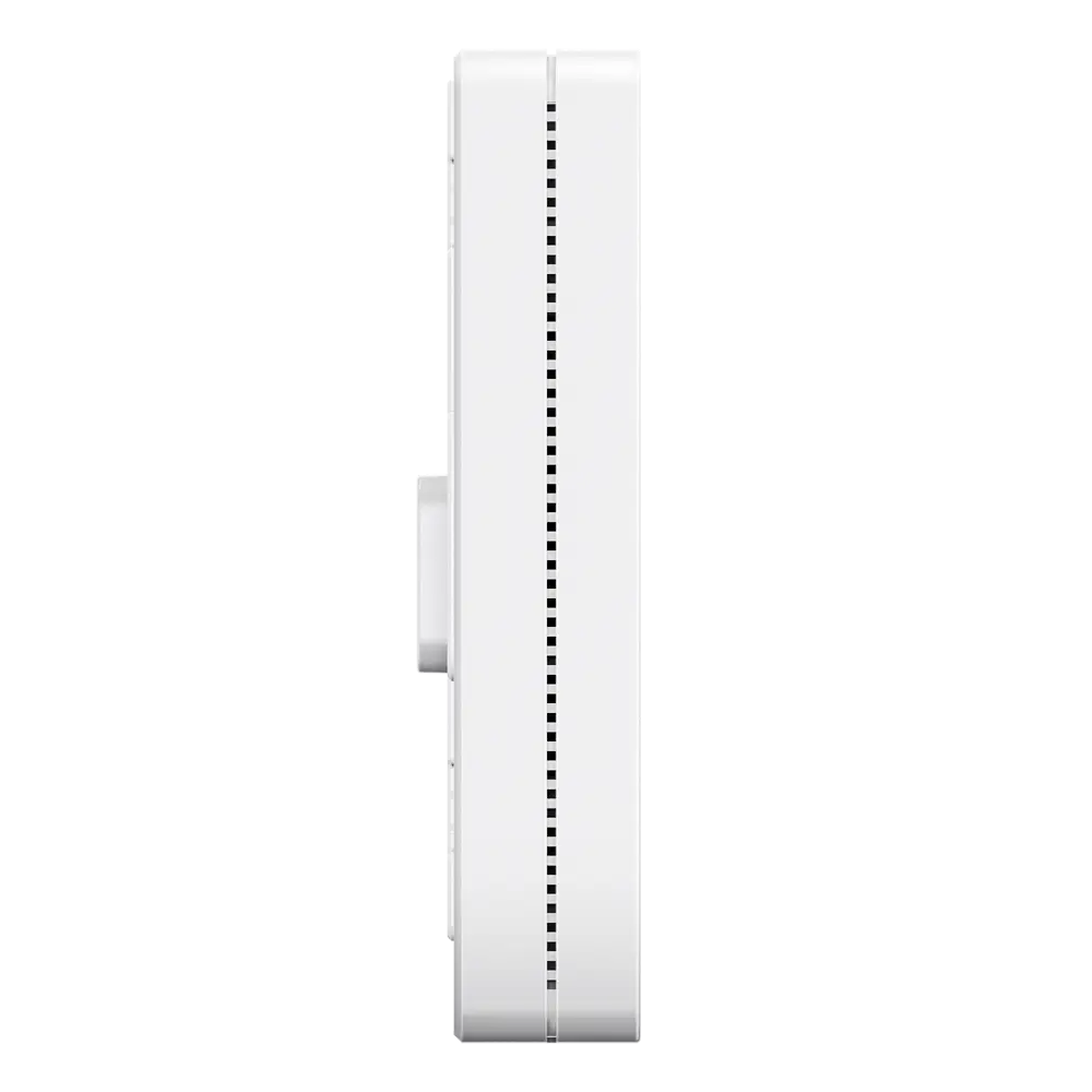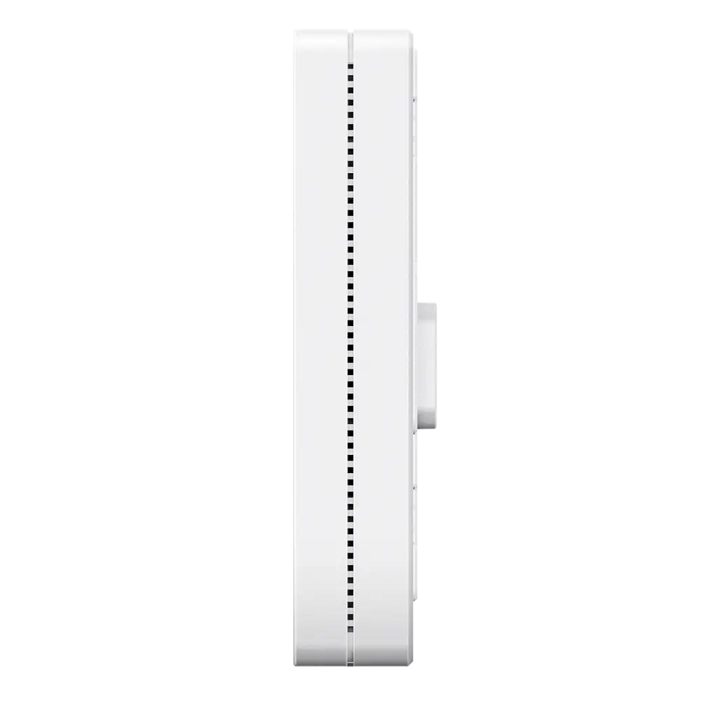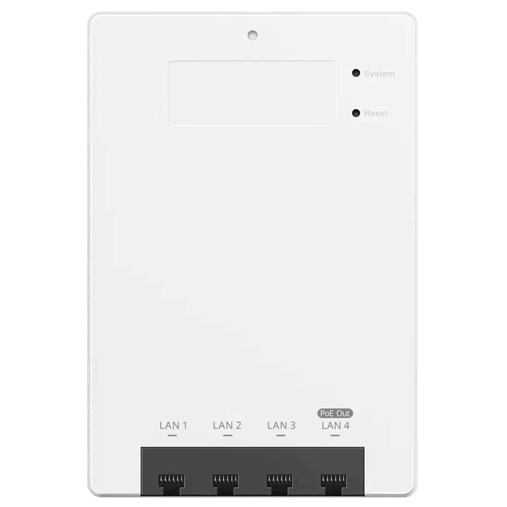 Access Point Wi-Fi 6 (802.11ax) montado na parede, frequências 2.4Ghz e 5Ghz, suporta 802.11a/b/g/n/ac/ax e uma taxa de transmissão até 3000 Mbps, concebido para ambientes interiores, integra-se discretamente em escritórios, hotéis, residências inteligentes ou espaços comerciais sem ocupar espaço visível no teto ou em estantes