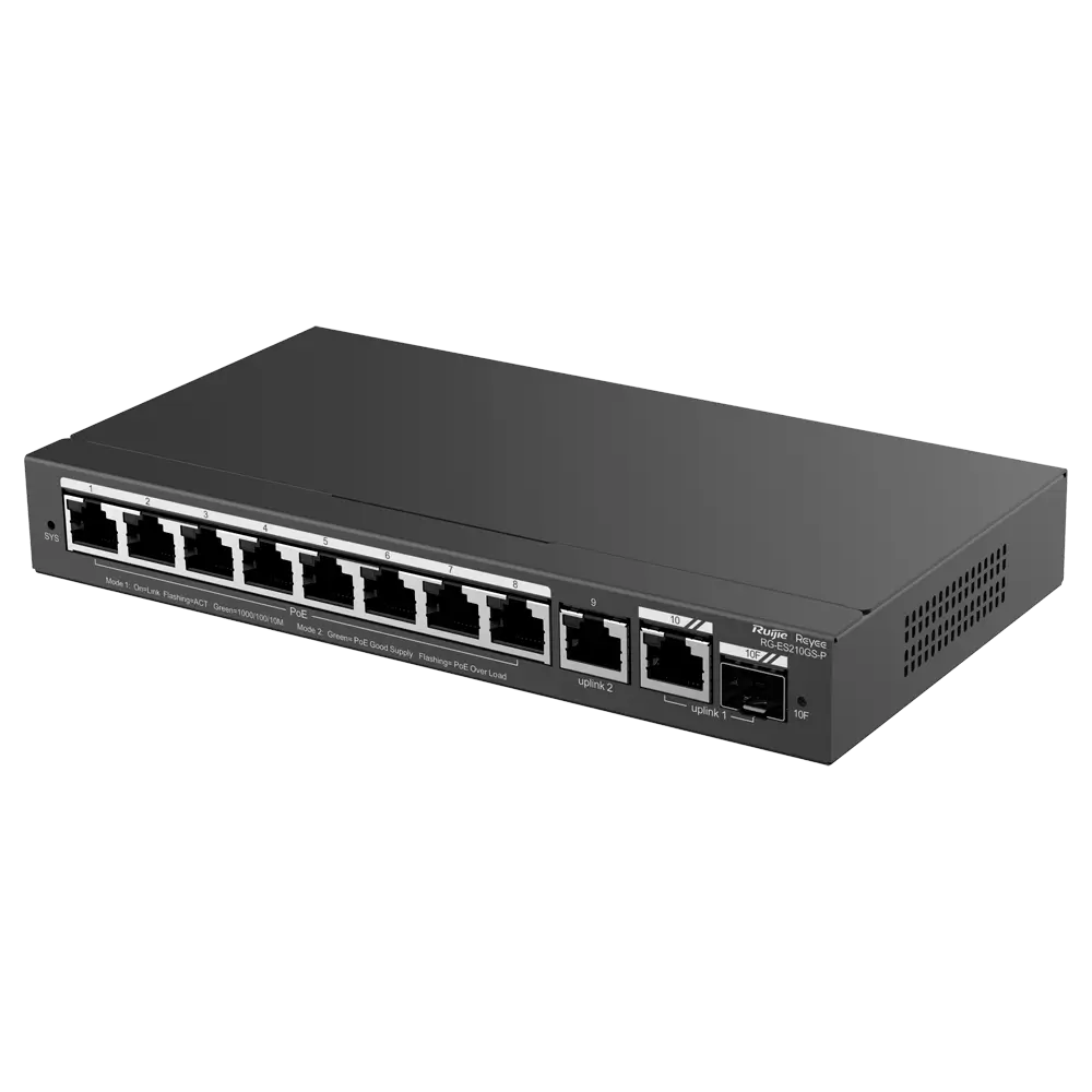 8 portas RJ45 10/100/1000 Mbps + 2 portas Uplink RJ45 10/100/1000 Mbps + 1 porta SFP Combo 10/100/1000 Mbps